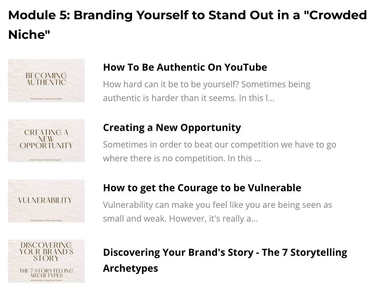 ✔ Don't try to be like everyone else on YouTube. It's easy to think 'if I do it like this person then I will be just as successful.' You will come to find that it alters your creativity and authenticity which is key to connecting and growing on YouTube. You will also become just another 'YouTuber' struggling to stand out in a crowded platform. In the program I cover the key points to stand out from all the other channels. Find your unique Super Power and shine your way to massive growth!